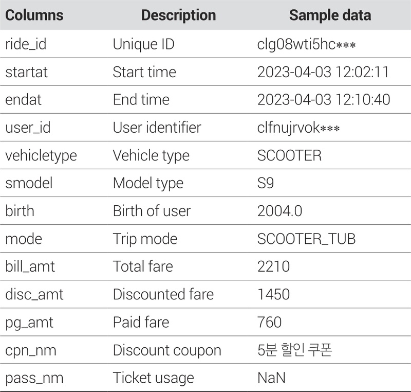 본 연구는 전동킥보드 이용행태의 차이를 시공간적으로 분석하는 것을 목표로 하며, 이를 위해 원자료에 기반한 전동킥보드 이용행태 특성을 <표 3>과 같이 정리하여 활용하였다.