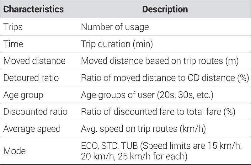우선, 통행 수의 경우 단위별로 집계되는 통행 수를 활용하였으며, 통행시간은 통행 종료와 시작 간의 차이를 분 단위로 계산하여 활용하였다. 이동 거리와 우회비는 통행 별 상세 경로를 기반으로 각각 실제 이동거리를 계산한 값과 이를 Origin(O)과 Destination(D) 지점 간의 직선 최단거리와 비교한 값을 활용하였다. 다음으로, 연령대는 이용자 수가 가장 많은 20대와 30대 및 기타 연령대로 구분하였다. 마지막으로 할인 수혜율은 공유서비스 이용에 대해 전체 금액 대비 할인받은 금액의 비율이며, 주행 모드는 사람들이 실제 공유서비스 이용 시 설정한 구분을 그대로 활용하였다.