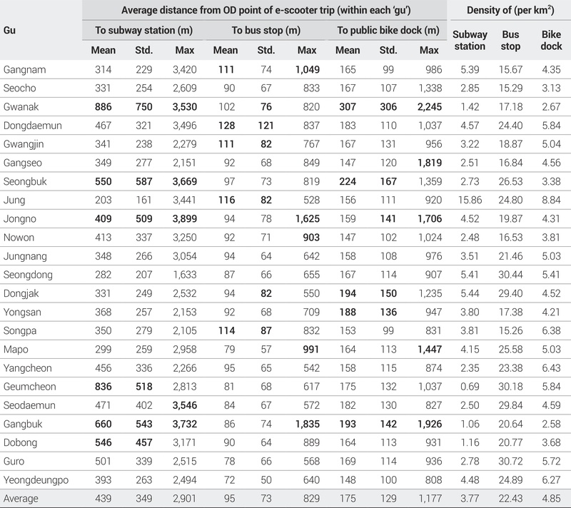 전동킥보드는 기존의 대중교통의 역할을 대체하거나 보완할 수 있다. 기존의 단거리 통행에 대해서는 서울시에서 운영 중인 공공자전거 ‘따릉이’를 대체할 수 있을 것이며, 다른 이동수단 전후 통행의 퍼스트마일 혹은 라스트마일을 충족시킬 수 있을 것이다. 이에 따라 본 연구에서는 시간대별 혹은 자치구별 기존 수단의 분포와 전동킥보드 통행의 기종점지와의 연계 특성을 분석하였다. 그러나, 전동킥보드 기종점지와 각 수단별 지점까지의 최단거리는 자치구 내 시설 밀도와 면적 등에 큰 영향을 받을 수 있다. 이에 본 연구에서는 각 수단별로 전동킥보드 기종점지와의 평균거리의 표준편차가 큰 상위 여섯 개 자치구만을 도출하여 시간대별 특징을 도출하였다. 자치구별로 전동킥보드 통행 기종점지와 지하철역, 버스정류장, 공공자전거 거치소까지의 최단거리와, 각 수단 이용시설의 자치구별 설치 밀도는 <표 7>과 같다.
