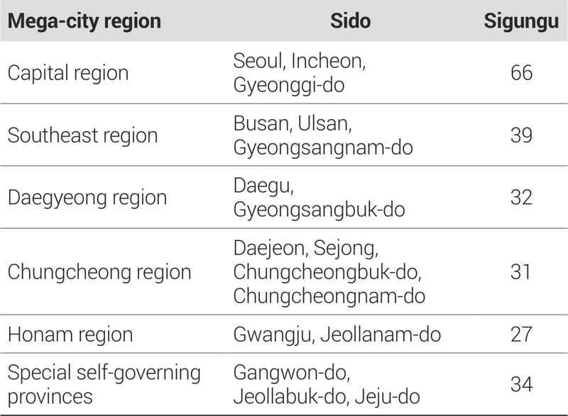 본 연구는 초광역권을 중심으로 지역 불균형의 사회·경제적 특징을 분석하고자 하였다. 이를 위해 먼저 분석 대상이 되는 지역 계층을 최근 국가 균형성장의 공간 단위로 주목받고 있는 ‘5극 3특’체계에 해당하는 초광역권으로 구분하였다(<Table 1> 참고). 분석에 사용한 자료 단위는 시·군·구로 총 229개 지역이며, 자치 시·군·구 226개, 세종특별자치시, 행정시가 아닌 2개 지역(제주시, 서귀포시)으로 구성된다.