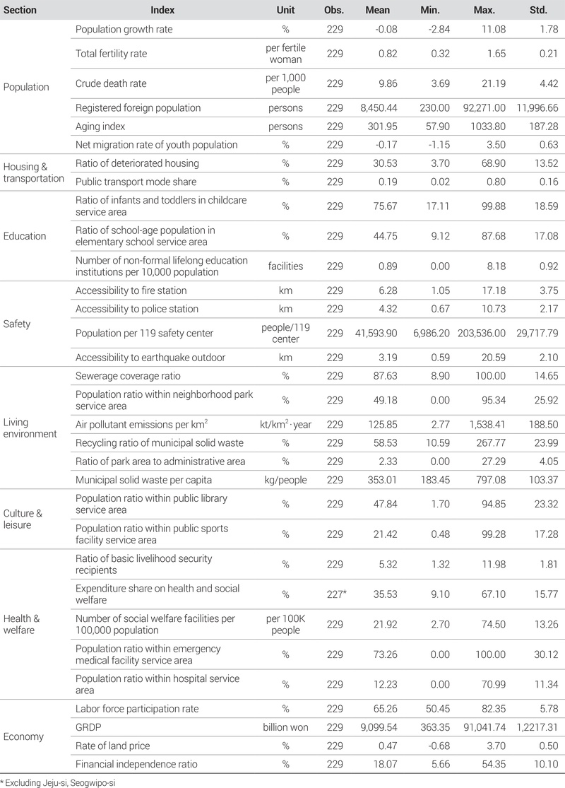 균형발전지표는 크게 핵심지표, 객관지표, 주관지표로 이뤄진다. 지난 2024년에는 핵심지표와 객관지표 간의 연결성 확보, 미생산지표 및 지역균형발전 부합 여부 고려, 지역경제 활성화 반영 등에 대응하고자 객관지표를 중심으로 지표체계를 개편하였다(지방시대위원회, 2024). 이에 따라 객관지표는 사회 부문과 경제 부분으로 재설계되었으며, 사회 부문은 인구, 주거 및 교통, 교육, 안전, 생활환경, 문화·여가, 보건복지 등 7개 분야 31개 지표, 경제 부문은 산업·일자리, 생산분배, 물가·재정 등 3개 분야 12개 지표로 구성된다. 본 분석에서는 분석자료의 지역 단위를 일치시키기 위해 총 43개 지표 중 시·도 단위 자료인 11개1)는 제외하고, 시·군·구 단위 자료인 32개를 사용하였다, 분야는 총 8개 분야로, 사회 부문의 7개 분야와 경제 분야(경제 부문 3개 분야 통합)로 구성하였다(<Tabale 2> 참고). 자료는 2024년 발표 자료를 사용하였으며, 대부분 지표의 기준연도는 2023년이지만 일부 지표의 경우 2021년, 2022년 자료2)를 사용하였다. 한편, 보건복지 분야의 ‘보건 및 사회복지 분야 지출 비중’의 경우, 자치 시가 아닌 제주시, 서귀포시는 자료가 없는 관계로 2개 지역을 제외한 자료로 분석하였다.