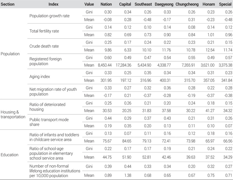 본 절에서는 32개 지표에 대한 전국 및 권역별 불균형도를 파악하고자 한다. 분야별로 지역 격차 수준을 살펴보면 다음과 같으며, 권역별 지니계수를 통해 권역 내 격차 또한 유추할 수 있다(<Table 3>, <Table 4> 참고). 권역별 평균값은 다음 절의 지니계수 분해분석 결과에서 함께 비교하여 권역 간 불균형 현황을 살펴보았다.