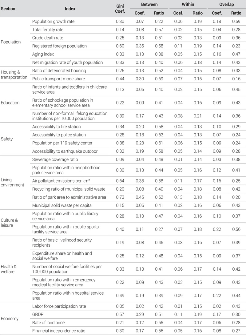 본 연구의 하위집단은 초광역권이며, 하위집단 내 불균형은 ‘초광역권 내 시·군·구 간 불균형’을, 하위집단 간 불균형은 ‘초광역권 간 불균형’을 의미한다. 한편, 중첩 불균형도는 초광역권으로 집단을 구분하였을 때 설명되지 않는 격차에 해당하며, 발전 수준이 낮은 권역 내에 발전 수준이 높은 시·군·구가 많이 포함되거나, 발전 수준이 높은 권역 내에 발전 수준이 낮은 시·군·구가 많이 포함될수록 중첩 요인이 크게 나타난다. 이상 세 요인의 영향력을 비교하여 초광역권 간 격차 해소가 필요한 영역과 초광역권 내 격차 해소가 필요한 영역을 살펴보고자 하였으며, 특히 초광역권 간 격차가 차지하는 비중이 큰 지표들을 중심으로 초광역권 균형발전정책 방향을 논의하고자 하였다.