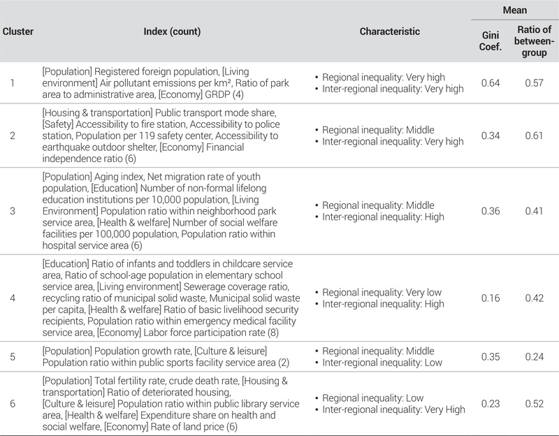 마지막으로 지니계수와 지니계수 분해분석을 통해 산출한 불균형 요인을 사용하여 격차 특징을 중심으로 32개 지표를 범주화하기 위해 군집분석을 실시하였다. 군집분석은 비지도 기계학습 기법 중 하나로, 전체 데이터를 유사하다고 판단되는 값들끼리 묶어 몇 개의 군집으로 나누는 작업을 의미하며, 이때 형성된 군집의 특징을 분석하여 군집 간의 관계를 확인할 수 있다. 본 연구에서는 대표적인 비계층적 군집분석 방법인 K-평균 군집분석(K-means clustering)을 실시하였다. 비계층적 군집분석은 실험 결과나 표본 등에서 얻은 결과를 특정 성질에 따라 분류하여 동질적인 몇 개의 군집(cluster)으로 분류하고, 각 군집의 성격을 파악할 목적으로 적용하는 분석 방법이다(권현진·김재환, 2017). 해당 방법은 사전에 설정된 K개의 군집에 속하는 개체들의 평균 값을 중심점으로 하여 근접한 거리에 있는 개체를 묶어나가며 군집을 형성하며, 알고리즘이 간단해 큰 규모의 데이터를 다루기 수월하고, 자료의 변환이 필요 없어 적용이 쉽다. 본 연구에서는 지니계수 분해분석을 통해 얻은 결과를 바탕으로 상관분석을 실시하여 유효한 특징값을 도출한 뒤, 이를 사용하여 군집분석을 실시하였으며, 군집별 격차 특징을 비교 검토하였다.