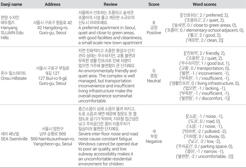 이후에는 각 문장에 포함된 단어에 감성 점수를 부여하고, 이를 합산하는 방식으로 긍정적, 중립적, 부정적 주거만족도를 산출하였다. 구체적으로, 감성어 사전을 기반으로 각 단어의 감성적 방향성과 강도를 수치화하고, 문장 내 모든 단어의 감성 점수를 합산하여 문장 단위의 총 감성 점수를 산정하였다(<표 2> 참조). 점수 총합이 양수일 경우 해당 문장은 긍정적 감성(긍정적 주거만족도), 음수일 경우 부정적 감성(부정적 주거만족도)으로 정의하였다. 감성 점수가 0에 해당하는 경우는 중립적인 감성(중립적 주거만족도)으로 분류하였다.