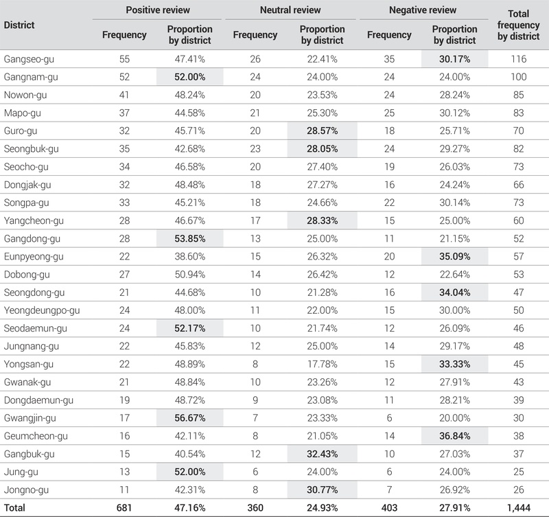 이 연구 또한 이와 유사한 결과가 나타났는데, 아파트 단지별 리뷰데이터를 자치구 단위로 집계한 결과, 리뷰데이터 수가 많은 단지가 포함된 자치구일수록 긍정적, 중립적, 부정적 주거만족도가 모두 높게 나타났다. 이에 단순히 자치구별 만족도 빈도를 비교하기보다는, 자치구 단위로 각 만족도 범주의 비율을 산출해 분석하는 것이 중요하다고 판단하였으며, 이를 <표 4>에 제시하였다.