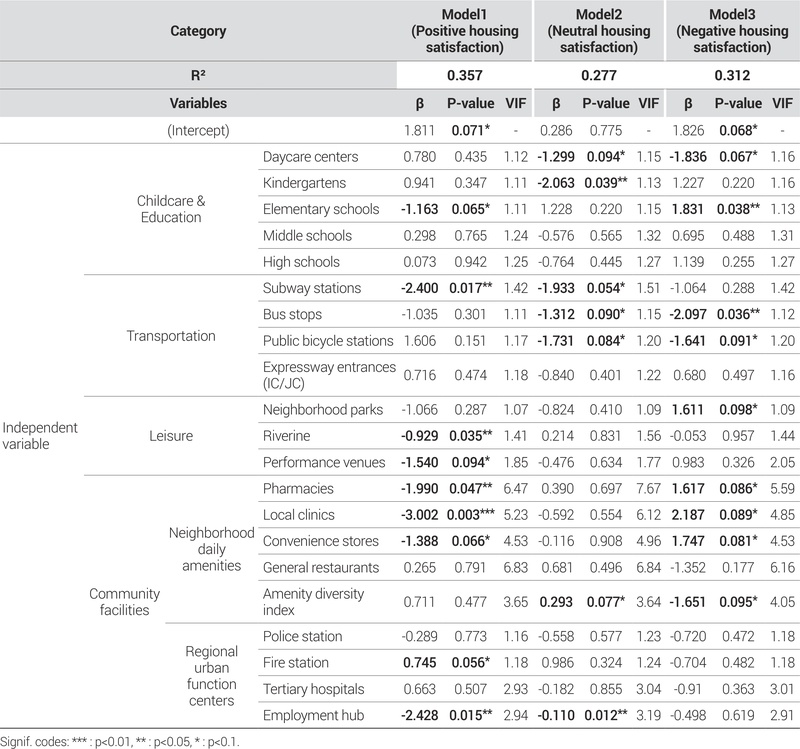 모형 설명력은 긍정적 주거만족도 0.357, 중립적 주거만족도 0.277, 부정적 주거만족도 0.312로 나타났다. 각 모형의 다중공선성(VIF)는 모두 10 미만으로 나타나, 변수 간 유의한 상관관계로 인한 문제는 없는 것으로 확인하였다. 이를 통해 세 모형 모두 일정 수준의 설명력을 확보하였으며, 긍정적 주거만족도 모형이 가장 높은 설명력을 보였다. 이는 전체 리뷰에서 긍정 비중이 크다는 점과 주거만족도가 전반적으로 긍정에 편향된다는 기존 논의(장윤정·고승욱, 2021)에 부합한다. 또한 세 모형의 종속변수는 동일한 리뷰 데이터를 기반으로 분류된 만큼 서로 독립적이라고 할 수 없다. 이는 긍정·중립·부정 간 상대적 비중 변화가 상호적으로 영향을 줄 수 있으며, 기존 텍스트 기반 감성분석 연구에서도 지적된 바 있다(Egami et al., 2022). 이러한 점을 고려하여, 이 연구에서는 긍정적 주거만족도를 중심으로 주요 결과를 해석하되, 필요한 부분에서는 중립과 부정 모형의 결과를 함께 비교하는 방식으로 해석을 진행하고자 한다.