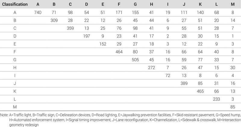 The 13 countermeasures selected in this way are representative items frequently applied in actual fields, and they were used in the following chapter as basic data for interaction effect analysis based on the application status and combined implementation type at each intersection.