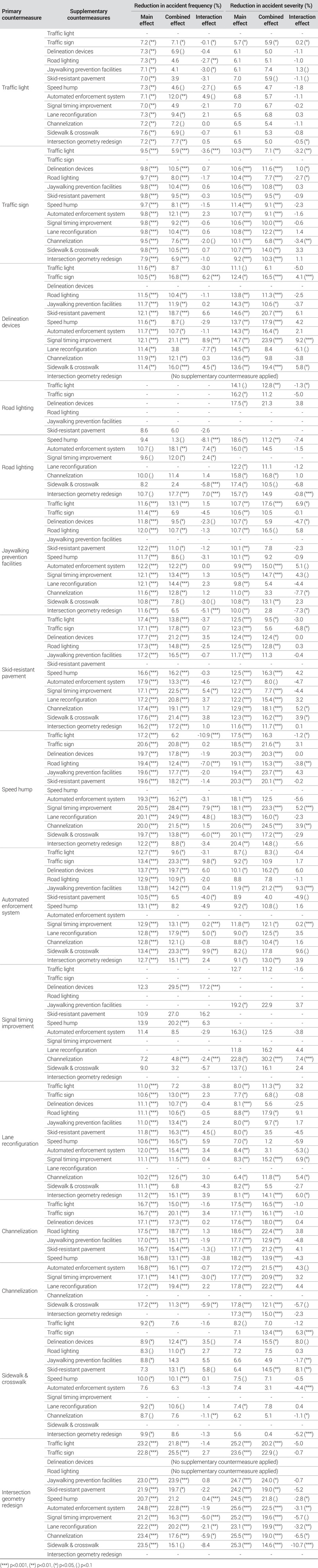 This study analyzed the effects of the combined implementation of traffic safety countermeasures in Korea to reduce accidents. While most existing studies have focused on single countermeasures, multiple measures are often applied together in practice. However, studies on their interaction effects remain limited. This study examined cases of combined implementation across accident-prone intersections, statistically assessing both main and interaction effects on accident frequency and severity. The results showed that certain combinations of countermeasures were more effective than single installations, contributing not only to accident reduction but also to mitigating accident severity. These findings underscore the importance of a strategic approach to traffic safety policies that considers the combined application of countermeasures, thereby helping reduce the social costs of traffic accidents.