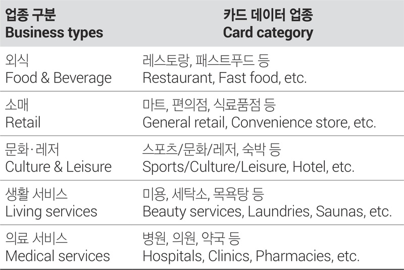 카드 소비 데이터는 250m 격자 단위로 제공되며, 소비자의 성별과 7개 연령 범주로 구분된다. 소비 업종의 경우 14개 대분류, 34개 중분류, 96개 소분류로 분류된다. 본 연구에서는 서울시 내 소비 업종의 공간적 분포를 분석하기 위해 지방행정 인허가 데이터의 서울시 상업시설의 좌표 정보를 활용하였으며, 두 데이터세트의 업종을 <표 1>과 같이 분류하였다. 이는, 도시의 활력 증진에 기여할 수 있는 대면 소비 활동이 이루어지는 업종을 대상으로 분류하였으며, 이에 전자상거래, 공과금 납부, 학비 결제 등의 결제 내용은 분석에서 제외하였다.