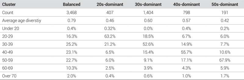 최종적으로 5개의 클러스터를 도출하였으며, 각 클러스터의 연령별 소비 비중은 <표 3>과 같다. 먼저, 20세 미만과 70세 이상은 전체 소비 분포 또한 매우 낮아 각 클러스터에서의 비중도 2% 미만으로 나타나 클러스터 구성에 크게 영향을 미치지 못한 것으로 보인다. 첫 번째, 균형 클러스터(n=3,468)는 모든 연령층이 고르게 소비하는 지역으로, 평균 연령 혼합도가 가장 높게 나타났다. 두 번째 클러스터는 20대 중심 클러스터(n=407)로, 20대 소비 비중이 63.2%이며, 30대의 소비 비중 또한 높게 나타나 젊은 연령대가 활발히 소비하는 지역으로 보인다. 세 번째 클러스터는 30대 중심 클러스터(n=1,404)는 30대 소비 비중이 52.55%이며, 인접한 연령대인 20대(18.52%)와 40대(15.37%)로 구성되어 있다. 네 번째 클러스터는 40대 중심 클러스터(n=798)로, 40대의 소비 비중이 55.72%로 높게 나타났으며, 중장년층의 소비가 활발한 공간으로 보인다. 마지막으로, 50대 중심 클러스터(n=191)로, 가장 적은 수를 보이나, 평균적으로 50대의 소비 비중이 67.91%로 나타나며, 해당 지역에서는 50대의 소비가 주를 이루고 있다. 도출된 클러스터 중 균형 클러스터를 제외하고, 특정 연령층이 지배적인 클러스터는 평균 혼합도가 낮게 나타나고 있다. 특히 20대 중심과 50대 중심 클러스터는 60% 이상의 특정 연령층 소비 비중을 보이며, 연령 혼합도가 가장 낮게 나타났다.