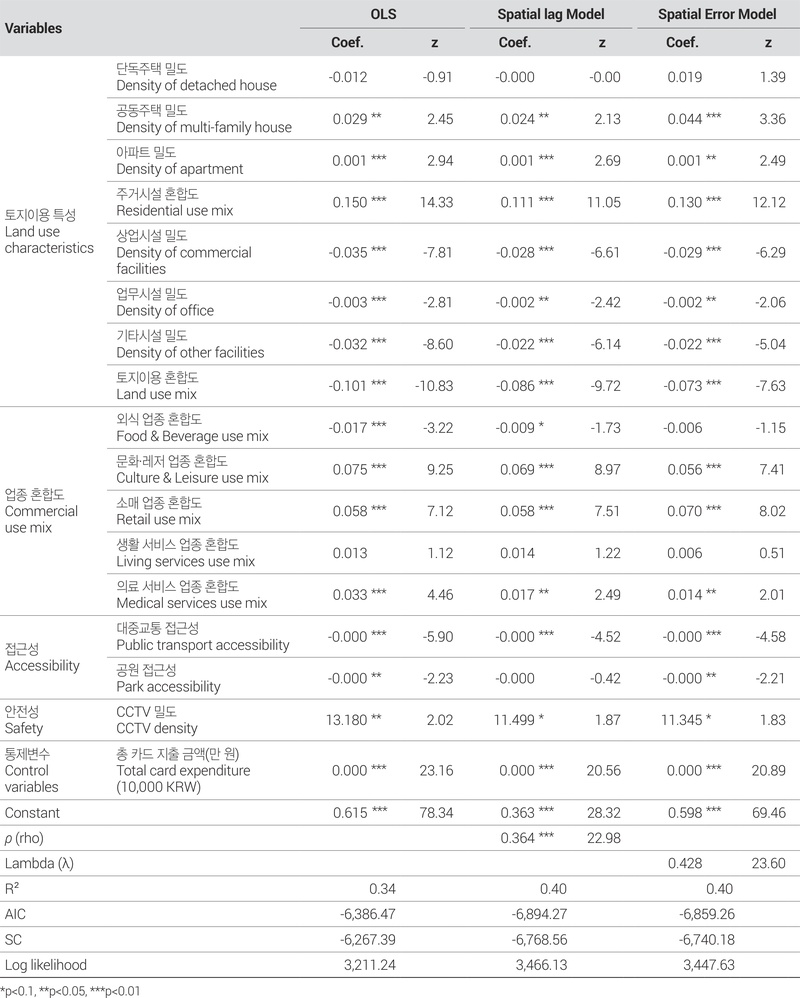 이어서, 연령 혼합도에 영향을 미치는 도시환경 요인을 실증적으로 분석하였다. 선행연구를 바탕으로 상업 특성, 토지이용 특성, 접근성 특성 등의 변수를 설정하였으며, 소비 규모가 연령 혼합도에 영향을 줄 수 있는 점을 고려하여 총 카드 지출 금액을 통제변수로 설정하였다. 회귀 분석에 앞서, 종속변수와 독립변수의 기술통계분석을 수행하였으며, 변수 간 다중공선성 문제를 검토하기 위해 분산팽창계수(Variance Inflation Factor, VIF)를 분석하였다. 모든 독립변수의 VIF값이 10 미만으로 나타나, 다중공선성 문제는 크지 않은 것으로 판단된다. 이후, 최소제곱법(Ordinary Least Squares, OLS) 모형은 잔차의 제곱합을 최소화하며, 변수 간 관계를 정량적으로 분석하는 데 활용된다. 그러나 OLS 모형은 공간적 자기상관성을 고려하지 않는다는 한계가 있다. 실제로 Moran’s I값을 통해 종속변수인 연령 혼합도에 공간적 자기상관성이 존재함을 확인하였다. 이에 공간적 자기상관성을 제어할 수 있는 공간회귀모형을 적용하여 인접 격자 간 영향을 반영한 분석을 수행하였다.