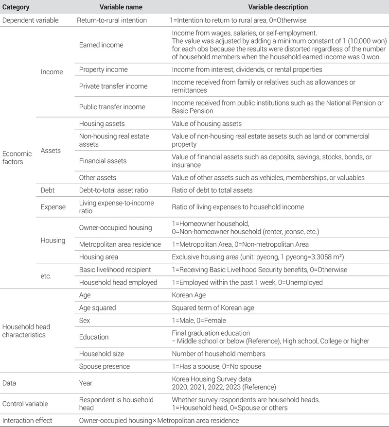 귀농·귀촌 의향에 영향을 미치는 경제적 요인을 정밀하게 파악하기 위해서는 소득이나 자산의 절대적 규모뿐만 아니라 가구의 실질적 부담 수준을 반영하는 지표의 구축이 필요하다. 특히 부채나 생활비의 경우 동일한 금액이라도 가구 특성에 따라 체감 강도가 다르게 나타날 수 있으므로, 본 연구에서는 부채, 생활비 변수를 비율변수로 구축하여 해당 변수들이 분석에 있어 가구의 실질적 부담 수준이 반영될 수 있도록 하였다.