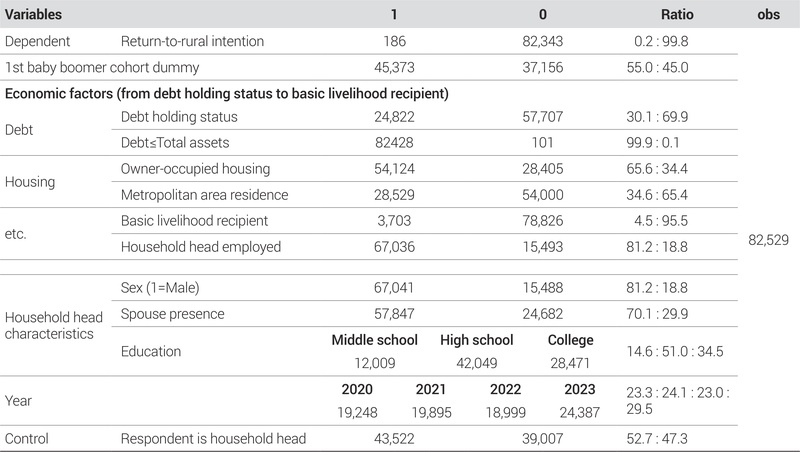 본 연구는 「주거실태조사」로부터 <Table 1>과 같은 변수를 선정하였다. 종속변수는 ‘귀농·귀촌 의향’으로, 응답자가 조사 시점 기준으로 향후 이주를 희망할 경우 이주희망 사유 두 개 중 하나로 ‘귀촌.귀농 등 자연환경이 좋은 지역을 찾아서’에 응답하였을 경우 1(귀농·귀촌 의향가구), 귀농·귀촌 외 다른 보기에 응답한 경우 모두 0(귀농·귀촌 비의향가구)으로 처리하였다. 또 이주의향이 없는 가구도 귀농·귀촌 의향이 없음으로 판단하여 0으로 처리하였다.