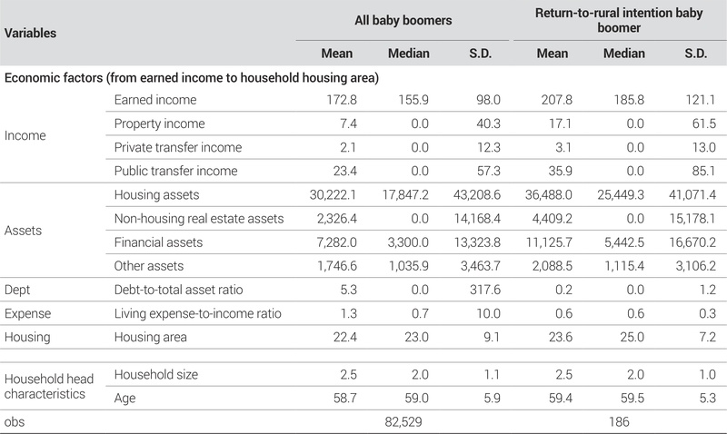 <Table 6>와 <Table 7>의 기술통계 분석결과를 통해 전체 베이비부머 집단과 귀농·귀촌 의향 집단을 비교한 결과, 경제적 요인 전반과 가구특성변수 일부에서 뚜렷한 차이가 확인되었다.