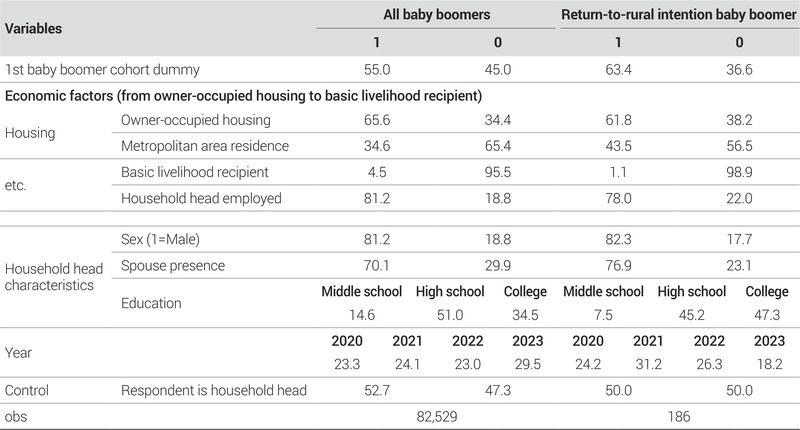 주거 요인은 자가주택 거주여부, 수도권 거주여부, 주택면적(평)을 사용하였다. 김유하 외(2023)는 자가주택 거주가 귀농·귀촌 의향에 부정적인 영향을 미침을 실증하였는데, 해당 연구에서는 1·2차 베이비부머의 차수를 통합하여 분석함에 따라 자가주택 거주가 세대별로 차이가 있는지에 대한 검증이 이루어지지 않은 상황이다. 또한 김동훈·윤종열(2023)의 연구에서는 수도권 거주여부가 귀농·귀촌 의향에 부정적 영향을 미치는 것으로 나타났는데, 통계청(2025)의 「2024년 귀농어·귀촌인통계」에 따르면 귀농·귀촌인의 직전 거주지 중 가장 많은 비중을 차지하는 시·도는 경기도(26.1%)인 것으로 나타났으며 42.7%는 직전 거주지가 수도권인 것으로 나타나 수도권 거주가 귀농·귀촌 의향에 부정적 영향을 미치고 있다는 해당 연구 결과에 대한 교차검증이 필요하다.