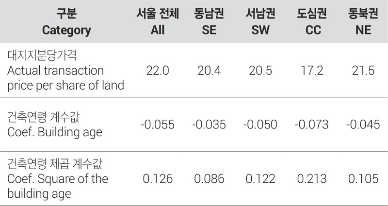 첫째, 건축연령에 따른 대지지분당 가격의 비선형성은 서울 모든 권역에 나타남을 확인하였다. 이는 기존 연구들의 분석결과와 동일한 양상으로 건축연령이 경과함에 따라 일정시점까지는 하락하지만 이후 재건축에 따른 주거환경 개선 및 경제적 이득에 대한 기대심리가 가격에 반영되고 있음을 나타낸다.