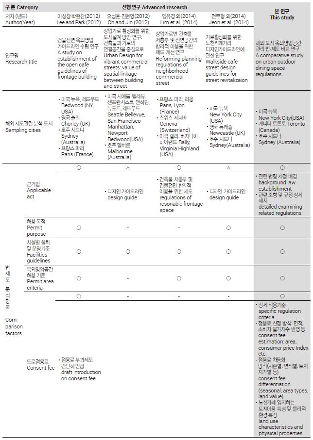 이성창·박현찬(2012) 연구는 서울시를 대상으로 건물전면 옥외영업 가이드라인을 제안하였다. 이 연구가 옥외영업을 허용할 수 있는 가로 선정을 위한 기준을 선정하는 데 초점을 두었다면 오성훈·진현영(2012) 연구는 상업가로에 옥외영업공간으로 설치된 데크·테라스 시설에 보다 주목하여 관련 지침과 제도적 대응방안을 도출하는 데 중점을 두었다. 임유경 외(2014)는 준공공 영역인 건물 전면공간을 합리적으로 운영될 수 있는 제도개선 방안의 내용을 담고 있다. 가로변 옥외영업공간을 주목한 이들 연구는 민간소유대지 내 공지에서의 옥외영업 행위 운영방안에 대해 공통적으로 초점을 두고 있다. 즉, 민간대지 내 건축선 후퇴공간과 같은 건물전면의 활용이 도시민의 옥외 수요에 적극적으로 부응하고 있음을 지적하면서, 일부 상충되고 있는 법령의 개정, 특례 제정 등 옥외영업 운영 개선방안을 제안하고 있다. 영업 공공소유부지에 대한 민간 옥외영업활동의 공익성을 옹호하고 이의 도입을 주장한 전무형 외(2014)는 뉴욕, 뉴캐슬, 시드니의 노천카페 가이드라인을 중심으로 노천카페를 허용하는 위치, 시설 기준, 운영관리 가이드라인을 확인하고, 이와 유사한 제도의 국내 도입을 제안하고 있다. 그러나 도시설계 관점에서 노천카페 디자인 가이드에 한정되어 근거법과 도로점용료 등 보다 근본적이고, 지속가능한 운영관리, 경제적 선순환 관점에서의 논의까지는 발전시키지 못한다는 한계를 지니고 있다. 이상과 같이 국내 선행연구는 도시 내 옥외영업공간의 출현에 대하여 아직까지 민간대지 내 옥외영업을 중심으로 검토되어 왔고, 공공소유공간의 옥외영업허용에 대해서는 논의가 시발된 단계로 시설 설치와 허용 기준을 다루는 데 그치고 있다.