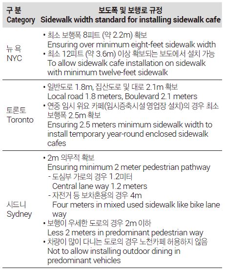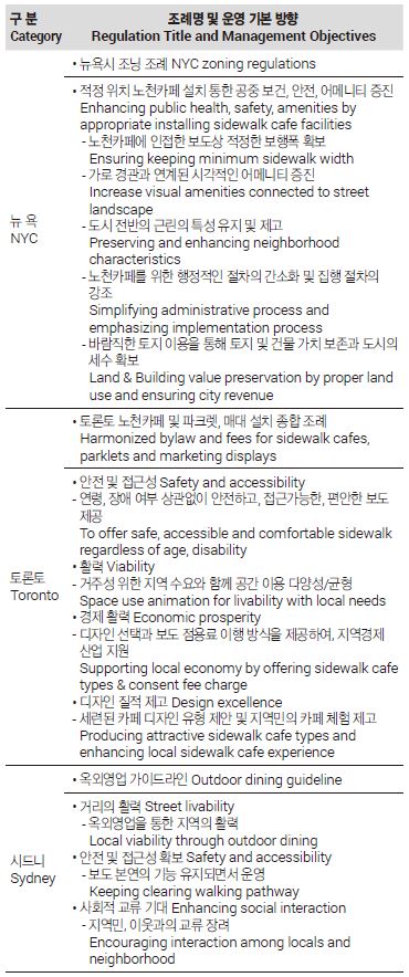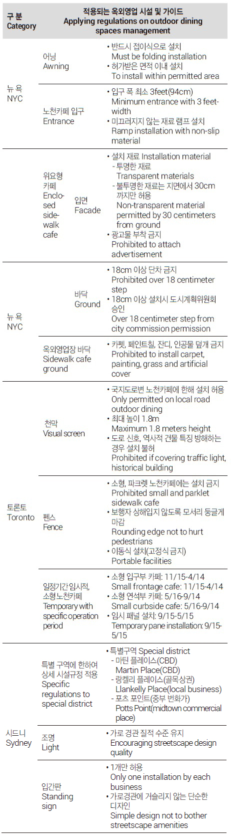 첫째, 도시정부 차원의 관리 지침을 수립하여, 하위 도시 행정단위가 옥외영업공간 운영과 관리를 할 수 있는 기본 지침을 수립하고 있다는 점이다. 해당 조례와 가이드라인은 상위법 혹은 관련 법령이 함께 연동되고 있다는 점도 주목할 만하다. 뉴욕 노천카페 가이드는 뉴욕시 공중보건법, 행정법, 뉴욕시조례를 함께 검토되고 있으며, 토론토의 경우 토론토 시법(city law)과 온타리오 식품위생 규정, 시드니시의 경우 도로법, 지방자치법이 함께 검토되어 가이드가 제시되고 있었다.