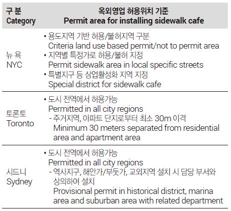 시드니시는 토론토시와 마찬가지로 시 전역에서 허용가능하나 역사지구와 같이 기존 블록의 기능이 유지되어야 하는 구역의 경우 담당부서와 상의 하에 설치하는 것을 규정하고 있다. 결과적으로, 세 도시 공통적으로 노천카페의 공간적 점유를 허용하는 기준은 토지용도와 매우 긴밀하게 관련되어 있음을 확인할 수 있다.