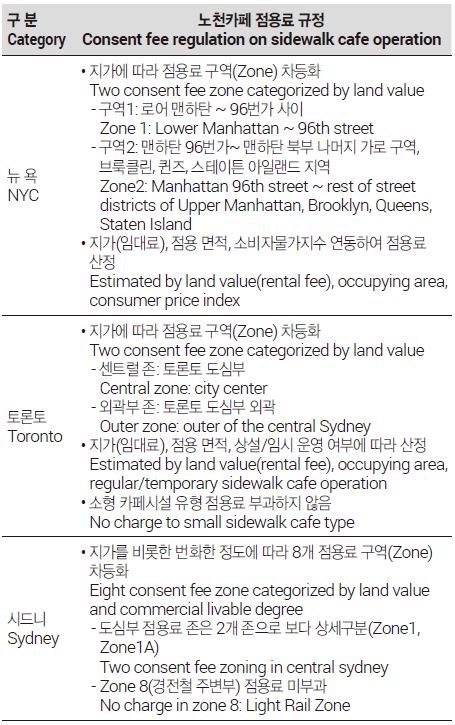 토론토와 시드니시의 경우 도심부, 도심 외곽 부로 나누어서 옥외영업시설 점용에 따라 수수료를 부과하는 기준을 두고 있다. 시드니시의 경우 도심부 존을 두 구역으로 나누어 상세 점용료를 산정하여 부과하고 있고, 토론토시는 소규모 스탠딩 옥외영업시설에 한하여 점용료를 면제하고 있는 점도 주목할 만하다(<그림 6> 참조).