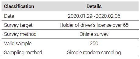 본 연구는 고령운전자의 운전면허증 반납의도에 미치는 영향 요인을 알아보기 위해 설문조사를 실시하였으며, 조사의 개요는 <표 1>과 같다. 설문 대상자는 특·광역시에 거주하는 65세 이상 운전면허증 소지자로 설정하였으며, 온라인 설문조사 전문 업체를 통해 2020년 1월 29일∼2020년 2월 6일(총 9일) 동안 설문을 실시하였다. 설문조사의 표본 추출방법은 단순무작위추출이며, 설문 유효율은 100%로 총 250부의 유효부수를 확보, 이를 바탕으로 분석을 실시하였다.