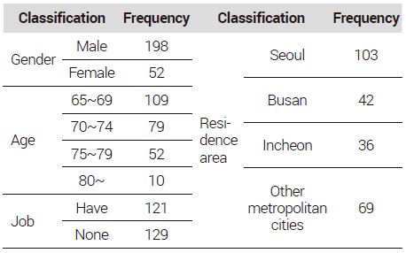 설문 응답자의 사회경제적 특성은 <표 2>에서 제시한 바와 같다. 성별은 남자 198명, 여자 52명으로 남자가 차지하는 비중이 전체 응답자의 79.2%를 차지하고 있다. 2019년 기준 운전면허증 소지 비율을 살펴보면, 남자 58.0%, 여자 42.0%로 남자가 더 높게 나타났다. 특히 고령자의 경우에는 이러한 현상이 더 극단적으로 나타나므로 본 연구의 응답자 성별분포는 인구분포를 고려 시 적절하다고 판단된다. 응답자의 연령분포는 65세 이상 70세 미만이 차지하는 비중이 41.2%(109명)로 가장 높게 나타났으며, 연령대가 높아질수록 차지하는 비중이 낮았다. 이와 같은 현상은 연령별 운전면허소지 현황에서도 동일하게 나타나고 있어 연령분포도 또한 적절한 수준으로 판단된다. 직업은 있는 경우가 48.4%, 없는 경우가 51.6%로 고령운전자의 약 1/2은 직업을 가지고 있었으며, 거주 지역은 서울이 차지하는 비중이 가장 높게 나타났다.