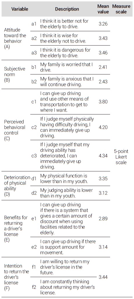 측정항목을 구체적으로 살펴보면, 첫 번째 잠재변수인 행동에 대한 태도(A)의 경우, ‘좋다고 생각한다’. ‘현명하다고 생각한다’, ‘위험하다고 생각한다’는 표현을 활용해 고령자가 운전을 하는 행위에 대한 개인의 신념을 파악하고자 하였다. 두 번째 잠재변수인 주관적규범(B)은 고령운전자가 운전을 하는 행위에 대해 자신에게 중요한 타인의 생각을 파악하고자 하는 것으로 ‘걱정한다’, ‘불안하게 생각한다’와 같은 표현을 활용해 고령운전자가 운전을 하는 행위와 고령운전자가 운전을 지속하는 행위에 대한 타인의 생각을 파악하고자 하였다. 자신에게 중요한 타인은 주로 가족과 지인이 주로 사용되나 그중에서도 특히 가족은 지인에 비해 더 중요한 타인으로 인지되는 경우가 많다는 점을 고려해 본 연구에서는 가족으로 한정해 측정항목을 구성했다. 세 번째 잠재변수인 지각된 행동 통제력(C)은 제약된 상황에서의 이동 및 운전에 대한 개인의 수행정도를 파악하기 위함을 목적으로 측정항목을 설계했으며, 네 번째 잠재변수인 신체능력 저하(D)는 고령운전자의 신체 및 판단능력에 대한 수용 혹은 과신 여부 등을 명확하게 확인하기 위해 ‘젊은 시절에 비해’라는 표현을 활용하여 잠재변수를 관측하고자 하였다. 마지막 잠재변수인 운전면허증 반납 관련 혜택(E)은 현재 다수의 지자체에 고령운전자의 운전면허증 반납을 유도하기 위해 시행하고 있는 운전면허증 반납 혜택이 운전 포기에 미치는 영향을 파악하기 위함을 목적으로 측정항목을 설계하였다.