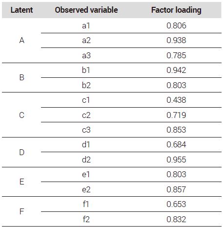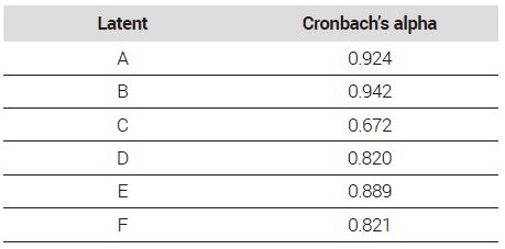신뢰성 평가는 Cronbach’s alpha값을 이용해 판단하게 되며, 0.6 이상의 값을 가질 시 신뢰도가 있다고 볼 수 있다(Taber, 2018). 분석결과, 모든 잠재변수의 Cronbach’s alpha 값은 0.672∼0.942로 산출되어 신뢰성을 확보했다고 판단할 수 있다.