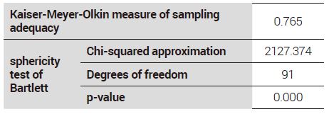 변수들 간의 상관관계가 다른 변수에 의해 잘 설명되는 정도를 나타내는 Kaiser-Meyer-Olkin(KMO) 값은 일반적으로 0.50 미만 시 수용할 수 없다고 판단한다(Hutcheson and Sofroniou, 1999). 본 연구에서는 KMO 값이 0.798로 도출되어 적정하다고 판단된다. 또한, 요인분석 모형의 적합성 여부를 판단하는 Bartlett의 검정 결과를 살펴보면, 유의확률이 0.000으로 도출되어 모형이 적합하다고 볼 수 있다.