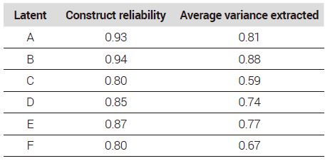 수렴타당성은 잠재변수 자체의 신뢰성 및 타당성을 파악하기 위한지표로 개념신뢰도인 Construct Reliability값과 분산추출지수인 Average Variance Extracted값을 활용하여 검증한다. 개념신뢰도는 관측변수들의 내적 일치도를 측정한 것으로 일반적으로 그 값이 0.7 이상이면 의미가 있다고 판단한다. 또한, 분산추출지수는 잠재변수에 대해 관측변수들이 설명할 수 있는 분산의 크기를 나타내는 것으로 그 값이 0.5 이상이면 의미가 있다고 판단한다(허준, 2013).