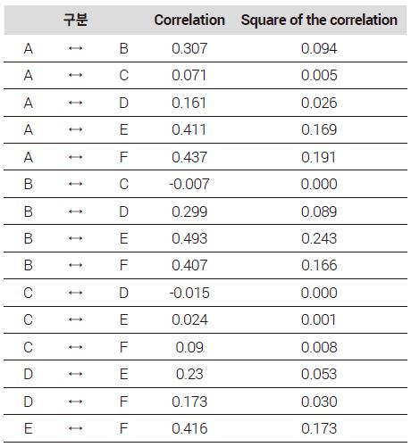 한편, 판별타당성은 2개 이상의 잠재변수 사이에서 구성된 개념 간의 중복 또는 유사성이 없고 차별성을 확보하고 있는지를 판단하기 위한 지표로 Average Variance Extracted값이 상관계수의 자승 값인 결정계수보다 클 경우, 타당도를 확보했다고 판단한다.