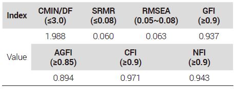 본 모델의 적합도 평가결과 모든 평가지표의 지수가 기준에 부합하는 것으로 나타나 본 연구모델의 잠재변수와 관측변수 간의 관계가 적합하다고 판단된다.