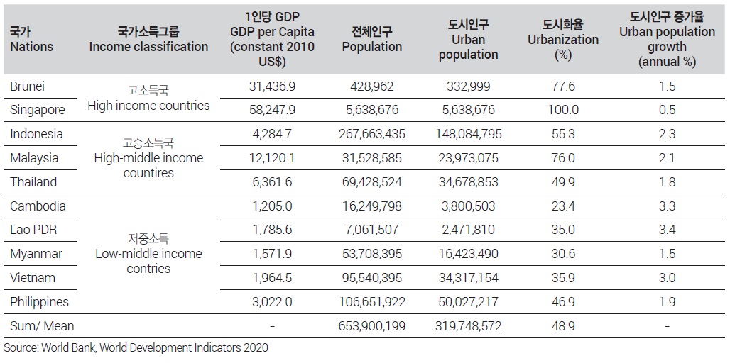 Table 1은 2018년 기준 국가별 경제 및 도시화 현황에 대한 자료이다. 도시화율을 보면, 2018년 아세안의 도시화율은 48.9%로 세계 평균 55.29%에 비해 낮은 편이다. 특히 도시국가인 싱가포르와 브루나이를 제외하고, 고중소득국인 말레이시아, 인도네시아, 태국은 도시화율이 약 50%를 넘어 아세안 평균보다 높고, 저중소득국인 5개국은 현재의 도시화율이 높지는 않지만, 연평균 증가율(도시화 속도)은 상당히 빠르게 높아지고 있다.