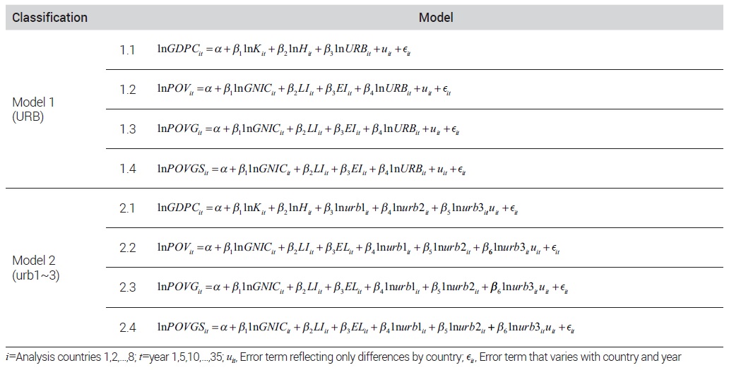 본 연구의 패널 선형회귀분석 기본 모형은 Table 2와 같다. 모형 1은 국가 전체의 도시화율을 설명변수에 적용한 모형이고, 모형 2는 전체 도시화율을 도시집적 규모에 따른 도시화율로 나누어 각각을 변수로 적용한 모형이다. 즉 도시화율 URB를 인구 500만 이상 대도시, 500만 미만 50만 이상의 중급도시, 50만 미만의 소도시로 나누어 urb1, urb2, urb3라는 설명변수로 만들었다. 각 모형은 경제성장, 빈곤율, 빈곤격차, 빈곤불평등 네 개의 종속변수를 갖는 세부 모형을 갖고 있다. Model 1.1과 2.1은 경제성장에 대한 기본 분석모형으로, 로머의 내생적 성장모형을 사용했다 (Romer, 1994; Acemoglu et al., 2015). Model 1.2~1.4와 2.2~2.4는 빈곤을 종속변수로 하는 모형이고, 빈곤을 측정하는 지표는 FGT 지수를 사용하였다.