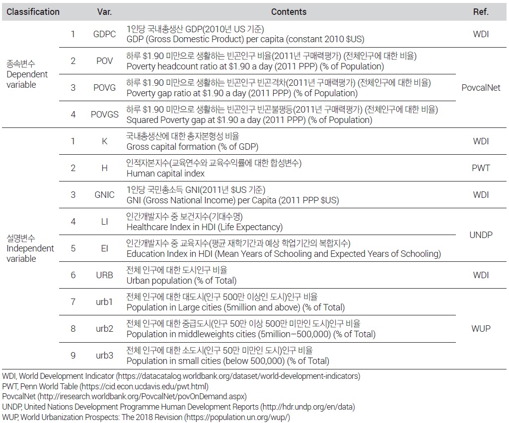 경제성장을 나타내는 종속변수는 1인당 국내총생산인 GDPC로 2010년 $US기준의 데이터를 사용하였다. 빈곤을 나타내는 종속변수는 POV, POVG, POVGS로 FGT 지수를 사용하였다. FGT 지수는 Pα로 표현되며, 매개변수 α에 따라 P0, P1, P2와 같이 세 가지 세부 지표로 나뉜다. 모형1.2와 2.2는 α 가 0인 빈곤율(Headcount Poverty Index)로 절대빈곤선 이하에 있는 빈곤인구의 비율이다. 모형1.3과 2.3은 α 가 1인 P1 빈곤격차(Poverty Gap Index)로 빈곤선에 대한 각 개인의 빈곤격차 비율(%)의 평균값에 대한 모형이다. 모형1.4와 2.4는 P2인 빈곤불평등(Squared Poverty Gap)에 대한 모형으로, 빈곤한 개인에게 빈곤격차를 제곱한 가중치를 부여하기 때문에 빈곤층 간 불평등 정도를 파악할 수 있다(방설아·강명구, 2019).