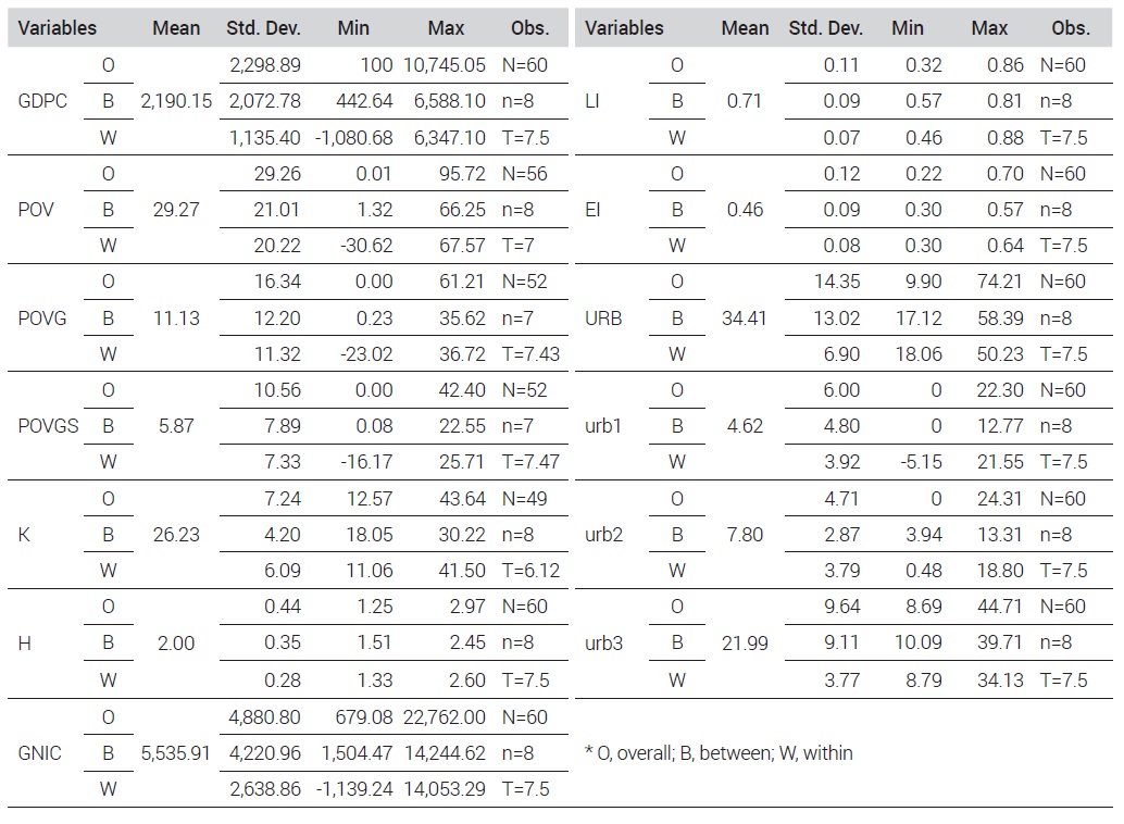 주요 변수에 대한 기초통계량 분석결과는 Table 4와 같다. 각 변수는 8개 국가별 평균 7.5년에 해당하는 약 60개의 표본을 갖고 있다. 1980년부터 2015년까지 35년의 분석데이터이지만 도시화율 변수가 5년 단위 자료이므로, 분석자료는 5년의 시간차를 갖고 있다. 1인당 GDP변수의 평균값은 USD 2,190이고 표준편차는 2,298이다. 표준편차에서 between효과가 within효과보다 2배 정도 큰데, 국가 간 1인당 GDP의 분포가 국가 내의 시계열 편차보다 더 크다는 의미다. 아세안 8개국 사이의 경제수준의 변화 정도가 크다는 것을 알 수 있다. 절대빈곤층의 비율인 빈곤율, 빈곤격차, 빈곤불평등의 평균값은 각각 29.27%, 11.13%, 5.87이다. 빈곤율의 최댓값은 95.72%로 1980년 미얀마이며, 가장 적은 0.01은 2015년 말레이시아의 빈곤율이다. 절대빈곤율은 하루에 $1.90 미만의 소득 또는 소비로 생활하는 사람의 비율을 의미하는데, 1980년 미얀마 인구의 95% 이상이 이 범주에 속했고 2015년에는 6.35%로 빈곤인구 비율이 급격히 감소했다. 그러나 캄보디아, 라오스는 2015년에 약 14%의 빈곤율을 보유하고 있는 바, 아세안 국가의 빈곤퇴치를 위한 노력이 많이 필요함을 확인할 수 있다. GDP에 대한 총자본형성비율 K의 평균값은 26.23%이며, 인적자본지수 H의 평균은 2.0, 1인당 GNI 평균은 USD5,535이다. LI, EI는 최댓값이 1인 HDI의 차원지수로 각각의 평균은 0.71과 0.46이다. 국가 전체의 도시화율 URB의 8개국 35년 평균값은 34.41%이다. 방설아·강명구(2019)의 연구에서 동일기간 105개국의 평균 도시화율은 50.62%이었는데, 이에 비해 아세안 국가의 도시화는 타 국가에 비해 많이 진행되지 않았다.