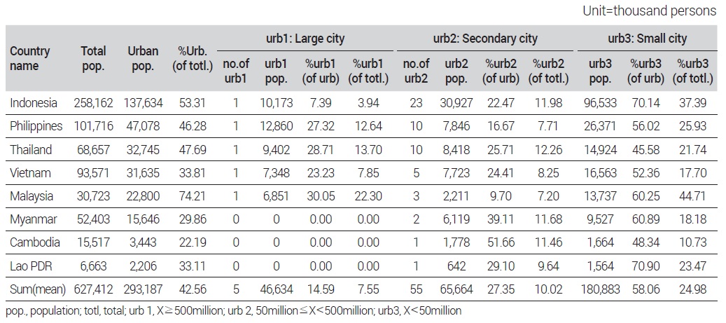 Table 5는 2015년 기준 각 국가의 도시화 및 도시인구 데이터를 도시집적 규모에 따라서 정리한 표이고, Figure 1은 Table 5를 도식화하여 표현한 그래프이다. 통합적 수준으로 표현되는 도시인구와 도시화율을 도시인구 집적 규모에 따라 urb1(대도시), urb2(중급도시), urb3(소도시)로 나누어 각 그룹별 도시인구 수와 도시화율, 전체 국가 인구에 대한 도시인구 비율로 정리하였다.5) 2015년 아세안 8개국의 평균 도시화율은 42.56%로, 대도시 7.55%와 중급도시 10.02%, 소도시 도시화율 24.98%의 합과 같다. 국가 인구와 도시인구가 가장 많은 나라는 인도네시아, 필리핀, 태국, 베트남 순서이다. urb1 대도시에서 인구가 가장 많은 나라는 필리핀, 인도네시아 순이고, 두 나라의 500만 이상의 도시집적(urban agglomeration)을 갖는 도시 수는 각 1개씩이다. 미얀마, 캄보디아, 라오스는 인구 500만 이상의 도시가 없다. 중급도시(urb2) 인구수가 가장 많은 나라는 인도네시아로, 이 규모에 해당하는 도시 개수는 23개이며, 인도네시아 전체 도시인구 중 22.47%가 중급도시권역에 산다. urb1 규모의 도시권이 형성되지 않은 국가에서 urb2 도시권은 국가 내에서 대도시의 역할을 하며, 도시화율이 높아지는 지역이다. 반면 도시화율이 가장 높은 말레이시아는 urb2 비중이 낮은 편이다. urb3는 인구 50만 미만의 소도시로 아시아 전체 인구 중 약 24.98%가 해당하고, 도시 인구 비율로는 58.06%가 사는 지역이다. 도시집적의 개수는 파악하기 어려우나, 모든 국가의 도시에서 가장 높은 비율을 차지하는 도시권역이 urb3이다. 특히 인도네시아와 라오스는 전체 도시인구의 70%가 urb3으로 소도시 인구분포가 상당히 높다.