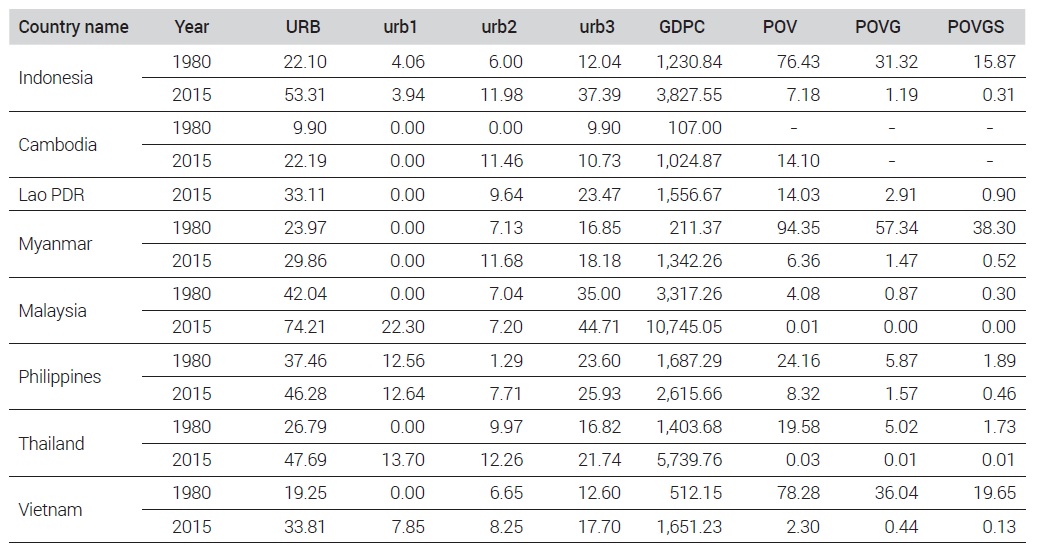 연구의 공간적 범위는 아세안의 10개 회원국 중 8개 국가(캄보디아, 라오스, 미얀마, 베트남, 인도네시아, 필리핀, 말레이시아, 태국)이다(Ministry of Foreign Affairs Homepage).1) 이 중 말레이시아와 태국을 제외한 6개국은 우리나라 국제개발협력(ODA)의 중점협력국가이며, 2018년 6개국의 ODA 총 지출액은 4억 5천 3백만 불로 전체의 ODA 예산규모의 17.89%에 해당한다(KOREA ODA 통계). 시간적 범위는 1980년부터 2015년이다. 도시화에 대한 자료는 UN이 매년 제공하는 세계 도시화 전망(World Urbanization Prospects, 이하 WUP) 데이터를 활용하였다. WUP는 도시 규모별 인구 통계를 5년 단위 자료로 제공하기 때문에 본 연구의 데이터는 5년 단위의 시간 갭을 갖게 되었다. 즉 1980년, 1985년…2015년의 평균 7.5개 연도의 패널 데이터를 분석하였다.