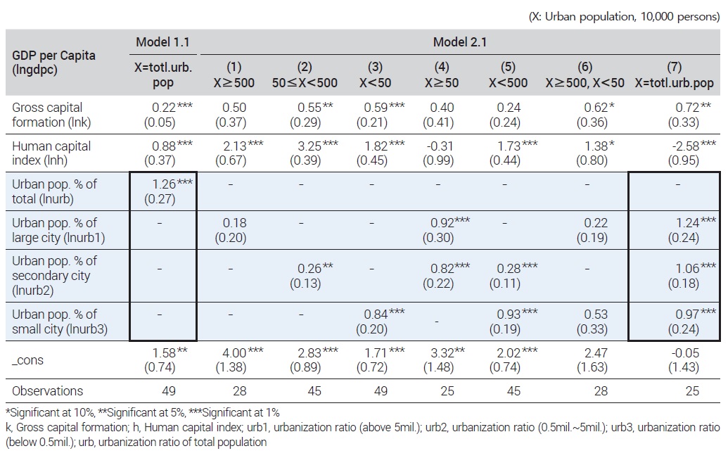 모형 2.1에서 (1)부터 (3)은 도시규모별 도시화의 순효과를, (4)부터 (6)은 도시집적 상호 간 도시화의 연계효과를 파악할 수 있다. 인구가 500만 명 이상인 대도시(1)의 도시화율은 유의확률 범위 내에서 통계적으로 유의하지 않았다. 인구 50만 이상 500만 미만의 중급도시(2)와 50만 미만의 소도시(3)의 도시화율 1% 증가는 각각 1인당 GDP를 0.26%, 0.84%만큼 증가시켰다. (4)는 대도시와 중급도시의 도시화율 변수를 동시에 포함하고 관측치는 25개가 있다. 대도시와 중급도시 도시화율 1% 상승 시, 1인당 GDP는 0.92%, 0.82%씩 증가하였다. 대도시의 도시화 효과를 제거한 (5)에서 도시화율 1% 증가에 따라 중급도시는 0.28%, 소도시는 0.93%만큼 1인당 GDP가 증가했다. 하지만 중급도시의 도시화 효과를 제거한 모형 (6)은 유의한 결과가 도출되지 않았다.