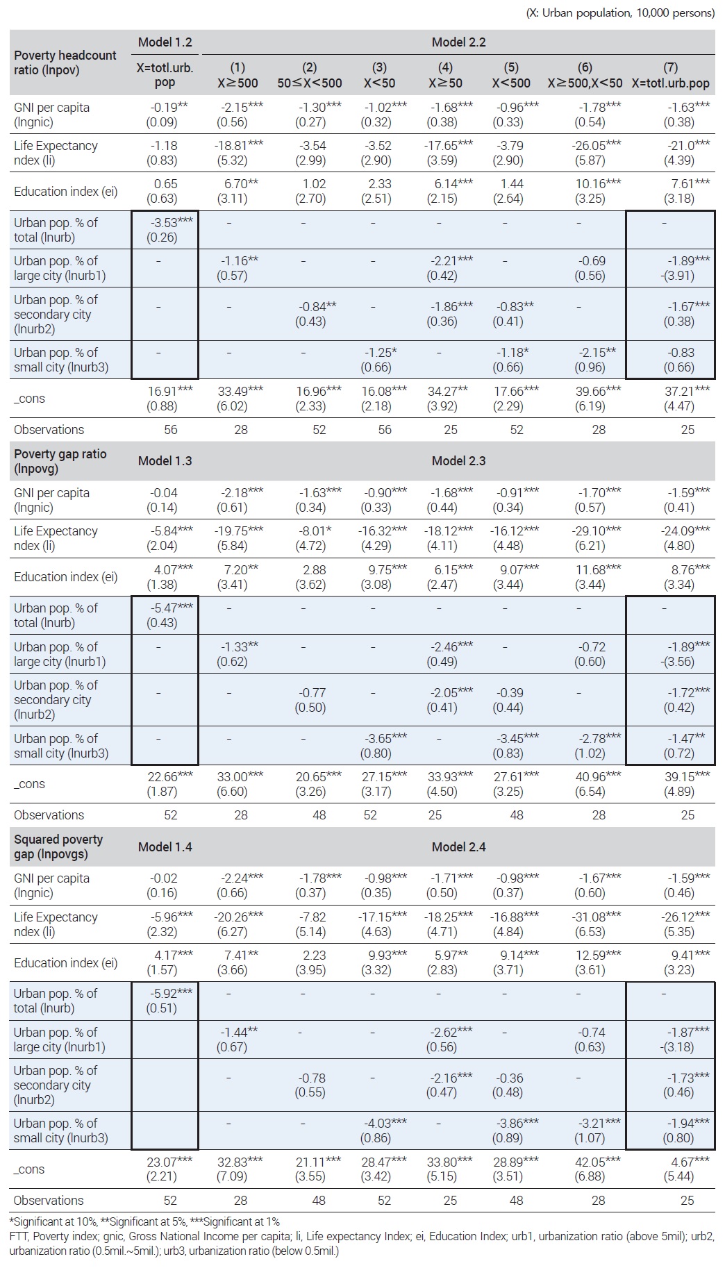 모형1.2와 2.2는 빈곤율(FGT0)을 분석한 모형으로 56개 표본을 분석하였다. 모형1.2에서 전체 도시화율 1% 증가는 $1.90 미만의 절대빈곤 인구비율을 3.53%만큼 감소시켰고, 유의확률 1% 수준에서 통계적으로 유의하다. 한편, 모형2.2(7)에서 대도시와 중급도시의 도시화율 1% 증가는 빈곤율을 각각 1.89%, 1.67%씩 감소시켰으나, 소도시의 도시화율은 빈곤율과 유의하지 않았다.