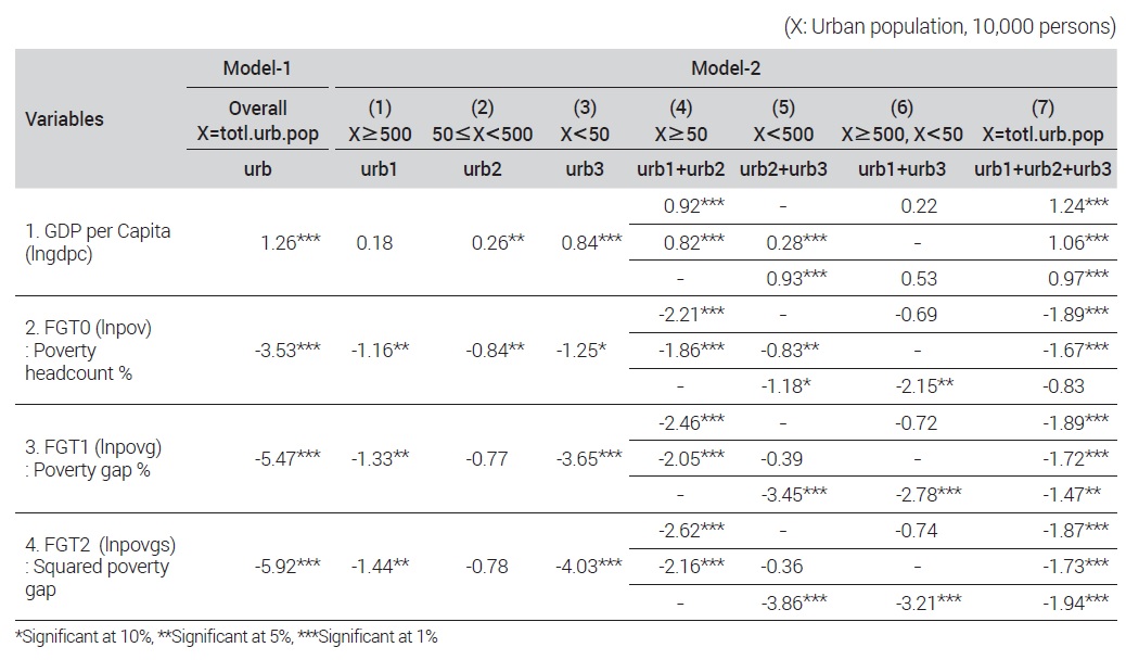 도시화와 빈곤격차, 빈곤불평등 분석을 통해 아래 내용을 추론할 수 있다. 우선 통합적 수준의 도시화율과 대도시, 중급도시, 소도시의 각 도시화율은 빈곤율, 빈곤격차, 빈곤불평등에 대해 모두 유의확률 1% 범위 내에서 통계적으로 유의하고, 양(-)의 상관관계를 갖는다.