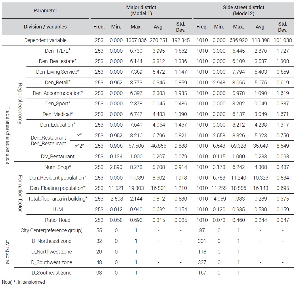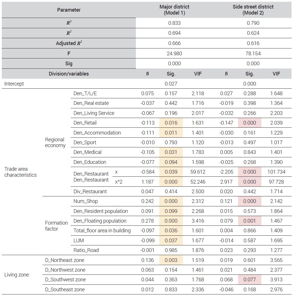 다중회귀분석을 진행하기 전 변수들을 대상으로 기초통계분석을 실시하였는데 결과는 <표 2>와 같다. 모형은 발달상권모형과 골목상권모형 두 개로 구분된다. 먼저 발달상권 모형의 음식점 폐업밀도 평균값은 270.251, 골목상권의 음식점 폐업밀도 평균값은 118.398로 발달상권에서의 음식점 폐업밀도가 더 높은 것으로 나타났으며, 상권별 음식점 폐업밀도에 대한 평균값의 차이가 있는 것을 알 수 있다.