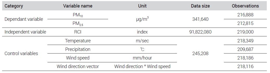 교통체증 외에도 미세먼지 및 초미세먼지 농도에 영향을 미치는 요인을 선행연구와 사용가능한 자료를 기반으로 선정하였다. 미세먼지에 영향을 미치는 다양한 변수들을 분석에 포함시키는 것이 가장 좋지만, 본 연구는 분석의 시간단위가 시(Hour)로 시간대별로 변화하는 변수를 찾기는 쉽지 않다. 따라서 앞에서 설명한 서울시 기상정보 자료를 기반으로 기온·강수량·풍속·풍향벡터를 통제변수로 사용하였으며. 최종적으로 선정된 변수목록은 <표 1>과 같다.