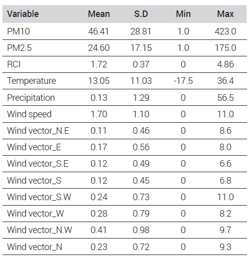 국내를 대상으로 한 연구에서는 서울시의 연간 미세먼지 농도변화에 강수량, 기온, 풍속이 통계적으로 유의한 수준에서 부(-)의 영향력을 주는 것으로 분석되었다(박충선, 2017). 즉, 기상여건의 변화는 국내 미세먼지 농도를 변화시키는 요인이라고 할 수 있다. 이와 같은 연구결과는 초미세먼지 농도의 결정인자를 도출하는 연구에서도 유사하게 나타났는데, 습도, 풍속, 풍향, 강수량, 기온이 통계적으로 유의미한 수준에서 초미세먼지 농도를 변화시키는 것으로 나타났다(이종현 외, 2017).