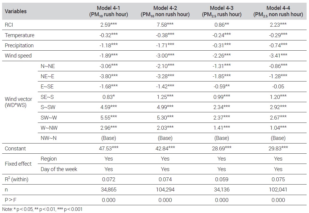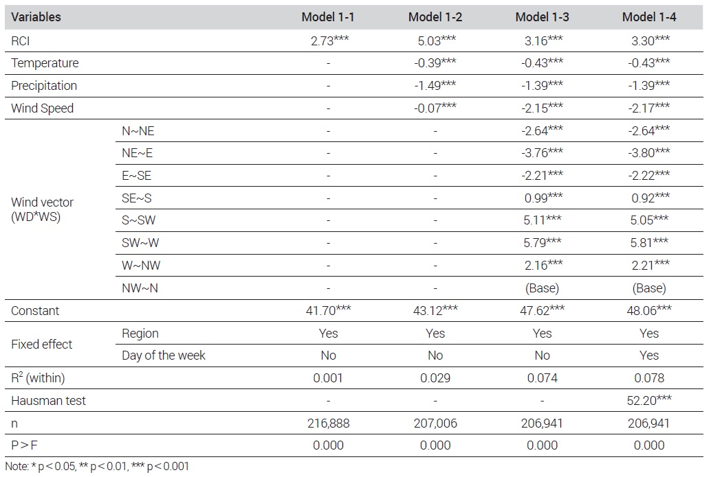미세먼지에 대한 교통체증지수의 영향력은 통제변수의 유무에 따라서 방향성과 크기가 달라질 수 있다. <모형 1-1>은 미세먼지 농도에 영향인자로 교통체증지수만을 포함시킨 모형, <모형 1-2>는 교통체증지수에 기온, 강수량, 풍속 변수를 추가한 모형, <모형 1-3>은 풍속변수에 풍향변수를 곱한 풍속×풍향 교차변수를 추가한 모형, <모형 1-4>는 모든 변수를 고려함과 동시에 시간고정효과를 추가한 모형이다. 이때 고정효과에는 지역별, 요일별 시간효과를 고려하였다. 모든 모형에서 계수 간의 큰 차이가 나타나지 않는 것으로 미루어 모형이 적절하게 설정되었음을 알 수 있다. 하우스만검정 결과 최종모형은 예상한대로 고정효과 모형이 우세한 것으로 나타났기에, 최종적으로 <모형 1-4>를 토대로 결과를 해석하고자 한다(<표 3> 참조).