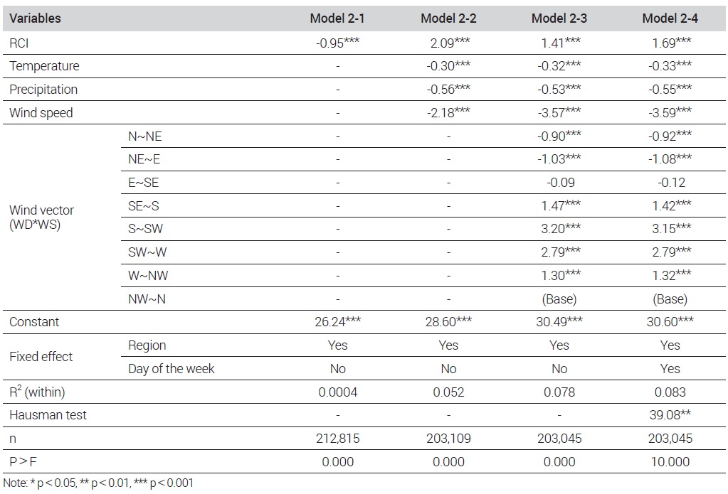 기온·강수량·풍속은 일반적으로 대기오염물질 총 배출량에 영향을 주지 않지만 대기 중에 포함된 미세먼지 및 초미세먼지 농도를 조절하는 요인으로 작용한다고 보고되고 있다. 기온이 낮은 봄·겨울철에는 대기가 안정화되어 대기 중 오염물질이 정체됨에 따라 대기오염물질 배출 총량이 적을지라도 미세먼지 및 초미세먼지 농도가 증가하고, 도시민의 건강에 부정적인 영향을 줄 가능성이 높다. 반면, 기온이 높은 여름철에는 대기가 불안정하고, 강수확률이 높아 대기오염물질의 이동이 원활해 미세먼지 및 초미세먼지 농도가 다른 계절에 비해 상대적으로 낮은 것으로 보고되고 있다(한정민 외, 2017). 따라서, 본 연구에서 사용된 통제변수들은 미세먼지 및 초미세먼지의 농도변화와 밀접한 관련이 있을 것으로 여겨진다.