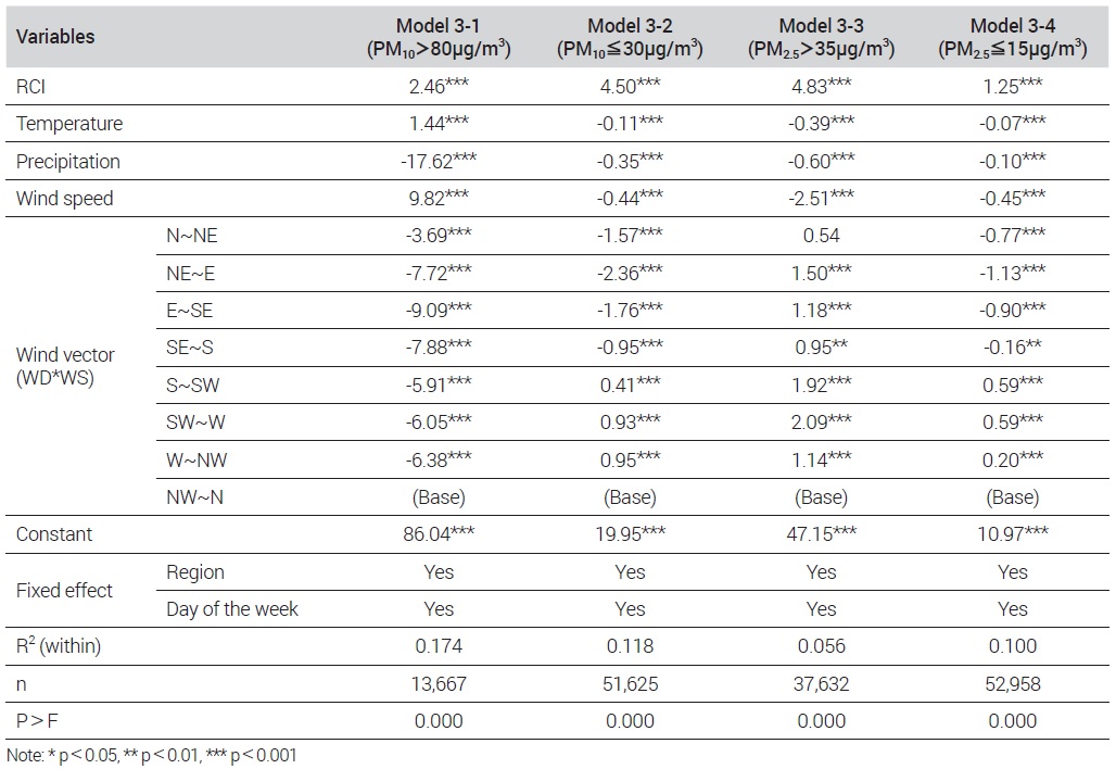통제변수의 영향력을 살펴보면, 기온, 강우량, 풍속은 모두 미세먼지와 음의 관계를 나타내었다. 즉, 기온이 상승하고, 강우량이 증가하고, 풍속이 증가하면, 미세먼지 농도는 감소하는 것으로 나타났다. 구체적으로 해석하면, 기온이 10℃ 상승할 때 미세먼지 농도는 4.3μg/m3, 강우(Rainfall)가 발생해 강수량이 10mm/h 증가할 때 미세먼지 농도는 13.9μg/m3, 풍속이 10m/sec 증가할 때 미세먼지 농도는 21.7μg/m3 개선되는 것으로 분석되었다. 풍향은 북동풍과 동풍, 남동풍이 불어올 때 미세먼지 농도가 개선되는 한편, 남풍을 비롯해 서풍계열의 바람이 불면 미세먼지 농도가 악화되는 것으로 나타났다. 이는 중국에서 넘어오는 월경성 오염물질 유입에 따라 대기질이 악화되는 것으로 판단된다.