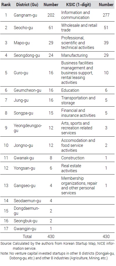 지역 산업의 특화에서 발생하는 MAR 외부효과와 산업의 다양성에서 발생하는 Jacobs의 외부효과와 상관관계를 분석하기 위해서 원 데이터에 기업들의 주소와 업종 정보를 보완할 필요가 있다. NICE 평가정보를 활용하여 「코리안 스타트업 맵」에 속한 각 기업들의 도로명 주소, 한국표준산업분류에 따른 업종(대분류, 중분류) 등을 취득하여 기업별 지리 및 산업정보를 갖추었다. 그 결과 「코리안 스타트업 맵(Korean Startup Map)」에서 서울시에 소재한 것으로 나타난 461개의 스타트업 중에서, 최종적으로 430개의 스타트업의 목록을 확정할 수 있었다. 이를 업종과 지역(구)별로 <Table 1>에 나타내었다. 약 3분의 2의 스타트업이 정보통신산업(Information and communication, ICT)에 속해 있는 것을 알 수 있다. 이는 대부분 미국과 유럽을 대상으로 하는 선행연구(European Investment Fund, 2019; Adler et al., 2019)에서 ICT 관련 기업이 높은 비중을 차지하는 것과 유사하다. 특히 비제조 스타트업의 압도적으로 높은 비중은 상대적으로 낮은 서비스업의 진입장벽과 서울의 탈산업화 도시의 성격을 반영한다.