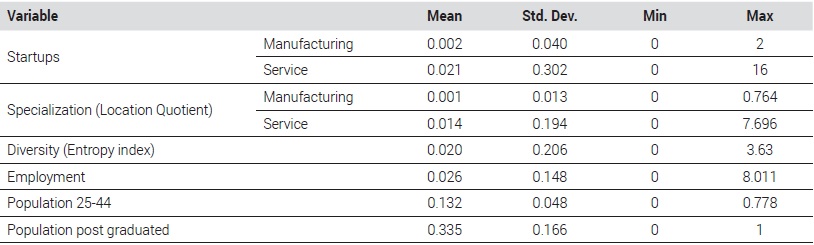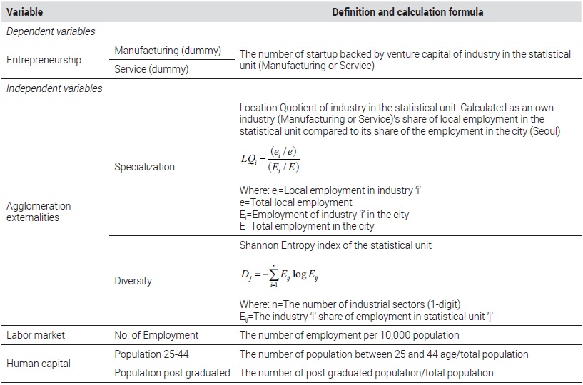 그 외, 그간 선행연구에서 지역의 기업가정신의 발생에 유의하다고 밝혀진 지역의 총고용 규모를 통제변수에 포함하였다. 지역의 고용 규모는 인력의 이용 가능성과 지역 경기를 나타내며 장기적으로는 스타트업에 긍정적 영향을 준다(Sternberg, 2009). 특히 혁신형 창업자일수록 기존 사업체에서 근무 경험을 바탕으로 축적한 지식과 네트워크를 활용한다는 것이 밝혀진바 있다(Chatterji et al., 2014). 그리고 인적자본의 지표로서 25-44세 인구 및 대학원 졸업자의 비중을 통제변수로 활용하였다. 이는 스타트업은 일반 창업에 비해 창업가의 연령이 어린 경향이 있음을 밝힌 연구(Duvivier et al., 2018)를 참고하였다. 또한 대학원 졸업자는 양질의 노동력을 의미할 뿐만 아니라, 지역에 핵심지식을 전달하는 수단과 기업 간 지식전파의 통로를 의미한다(Qian et al., 2012; Sternberg, 2009). 서울시 내 대학원 졸업자의 인구분포는 대학의 지리적 분포와 일치하지는 않는다는 점이 주목할 만하다. 각 인적자본의 지표는 인구 총규모에 대비한 비중으로 산출하여 지역 간 인구 규모의 불균형을 통제하고자 하였다. 이상 설명한 변수들의 자세한 측정방법을 <Table 2>에, 요약통계량을 <Table 3>에 나타냈다.